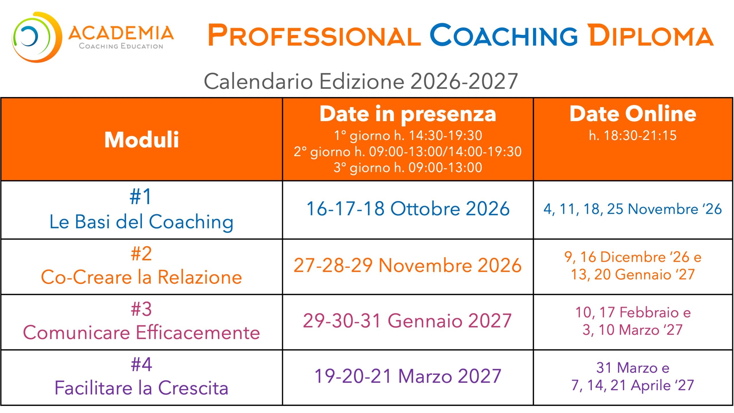 Academia Professional Coaching Diploma è un programma di formazione avanzata per coloro che vogliono diventare Coach Professionisti secondo gli Standard, le Competenze e il Codice Etico di ICF – International Coaching Federation. Un programma Accreditato Level 2-ICF, di 150 ore, in classi con gruppi di massimo dodici partecipanti.